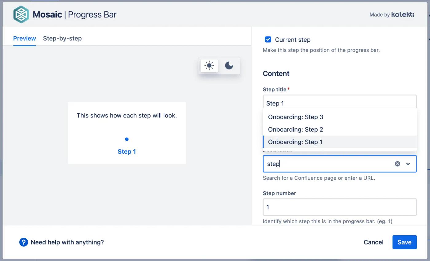 A progress bar is a visual representation of a user’s progress through a set of steps. A progress bar gives users the context to track completion and ensure nothing gets missed. In Confluence, each step on the progress bar relates to a different page.