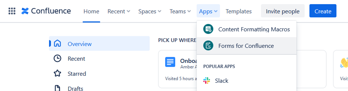 1. Click on the 'Apps' tab in the sidebar, then select Forms for Confluence. This will take you to the Forms for Confluence homepage.